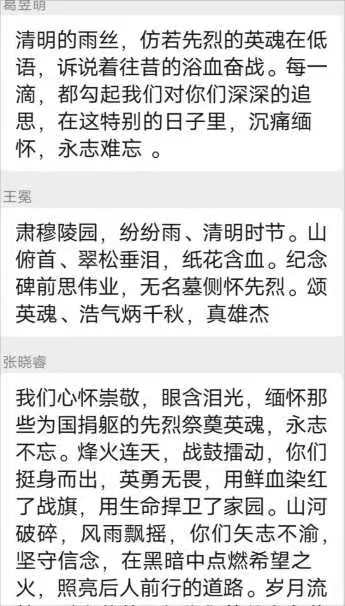 为了让活动更加生动和互动,活动中还设置了微信云发言环节。通过平台,参与者们纷纷表达了对英烈的崇敬与怀念。一位同学发言表示:“肃穆陵园,纷纷雨、清明时节。山俯首、翠松垂泪,纸花含血。纪念碑前思伟业,无名墓侧怀先烈。颂英魂、浩气炳千秋,真雄杰。”通过这次活动,同学们深刻感受到先烈为我们今天的幸福生活所作出的巨大牺牲。