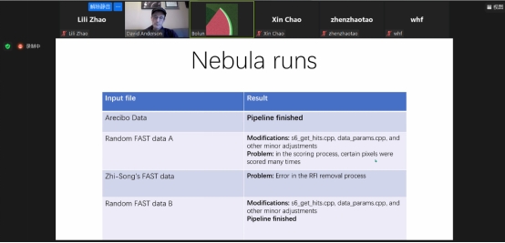 研讨会上,北京师范大学黄博伦对Nebula终端运行遇到的问题进行了总结,天文大数据中心学生对具体技术问题进行了汇报和展示,包括程序参数修改、数据结果对比等内容;David对程序运行存在的问题进行了详细解答和指导。
