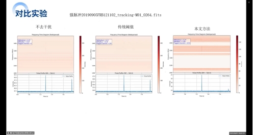 会上,李昂同学聚焦"基于犹豫模糊聚类的射电干扰抑制技术",重点探讨了算法验证体系构建中的核心难题——如何构建科学量化的RFI抑制效果评估体系。牛佳瑞博士和付秋阳博士对研究成果给予高度评价,并针对性地提出优化建议:其一,在目标识别模块构建"瀑布图-脉冲轮廓图-色散时间图"三维特征处理机制,提升多维数据耦合分析能力;其二,创新引入高斯噪声模拟开展对比实验,通过严苛场景验证算法鲁棒性;其三,建立包含信噪比提升率、脉冲轮廓保真度等指标的标准化评估体系,为射电干扰抑制技术提供客观评价标尺。这些建议既具理论高度,又含实践温度,为研究生突破技术瓶颈提供了清晰路线图。