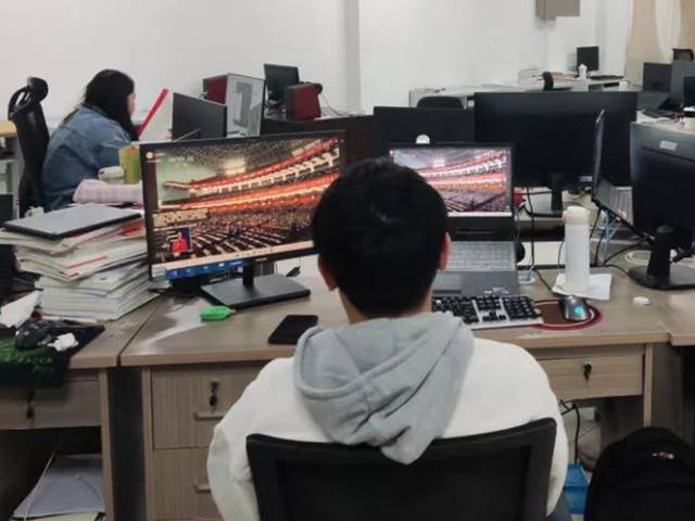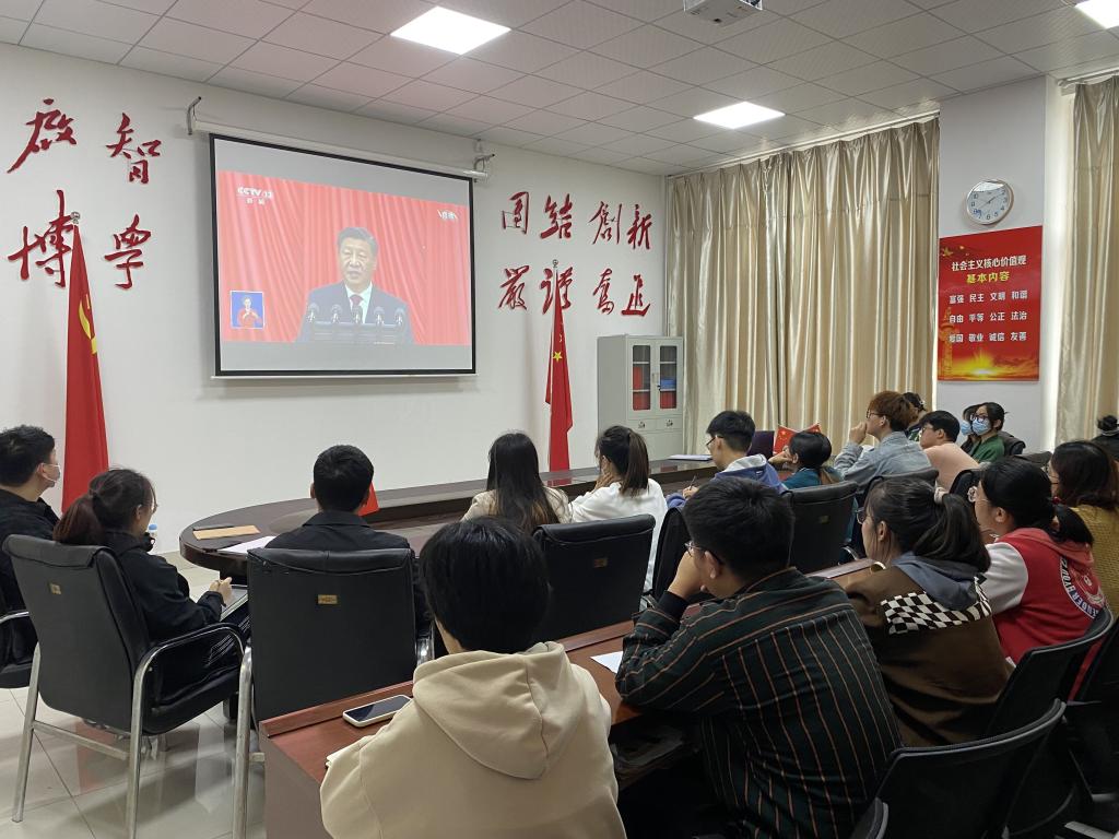 入党积极分子、共青团员在明理楼教室集中收看党的二十大开幕会。