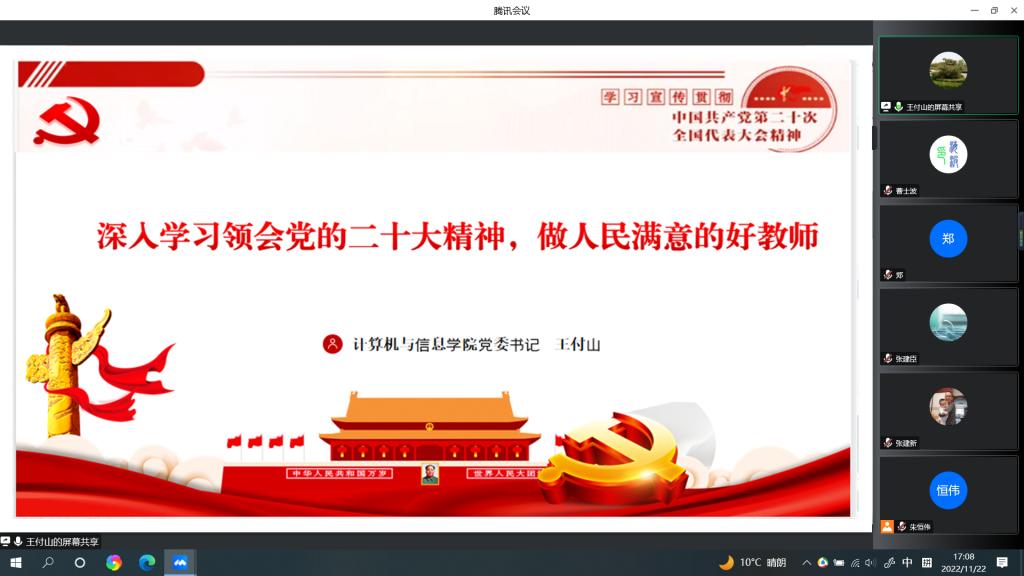 11月22日,啊轻点内射在线视频举办学习贯彻党的二十大精神宣讲会,学院党委书记王付山作宣讲报告。宣讲会以线上的形式召开,全体教职工参会。