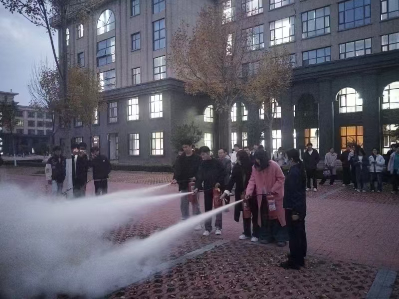 在讲座中,党委书记王付山组织大家进行了消防水枪和灭火器的实操演练,指导师生用干粉灭火器对现场设置的小型模拟燃烧点进行灭火操作,学习灭火器的使用方法。