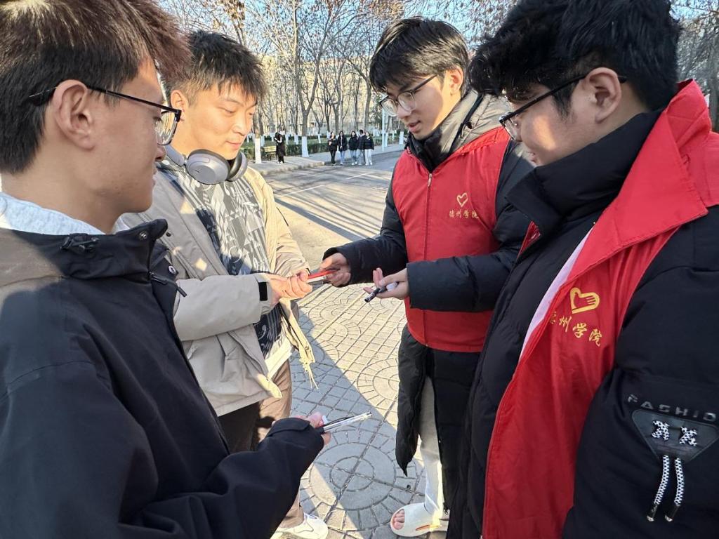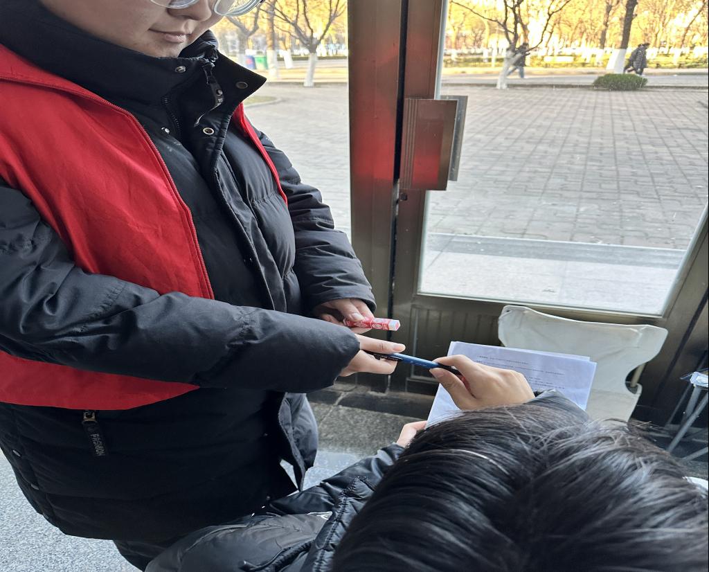 在考试当天,志愿者们早早来到考场外,设立了“四级助力服务点”。当同学们陆续抵达考场时,志愿者们热情地向他们发放文具袋,并送上真挚的考试祝福。对于那些因紧张而忘记携带文具的同学,志愿者们的及时帮助让他们松了一口气,能够以从容的心态迎接考试。