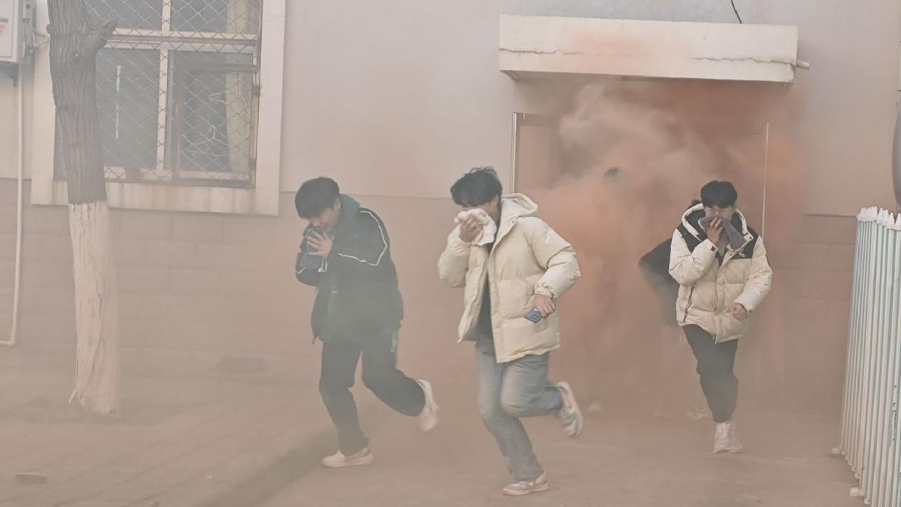 随着急促的警报声在校园上空骤然响起,消防演练正式拉开帷幕。学生们迅速反应,在宿舍内用湿毛巾捂住口鼻,低姿弯腰,按照预定的逃生路线有序撤离。短短几分钟,全体学生便安全疏散并集合完毕。演练过程紧张有序,充分展现了学生们良好的应急素养。