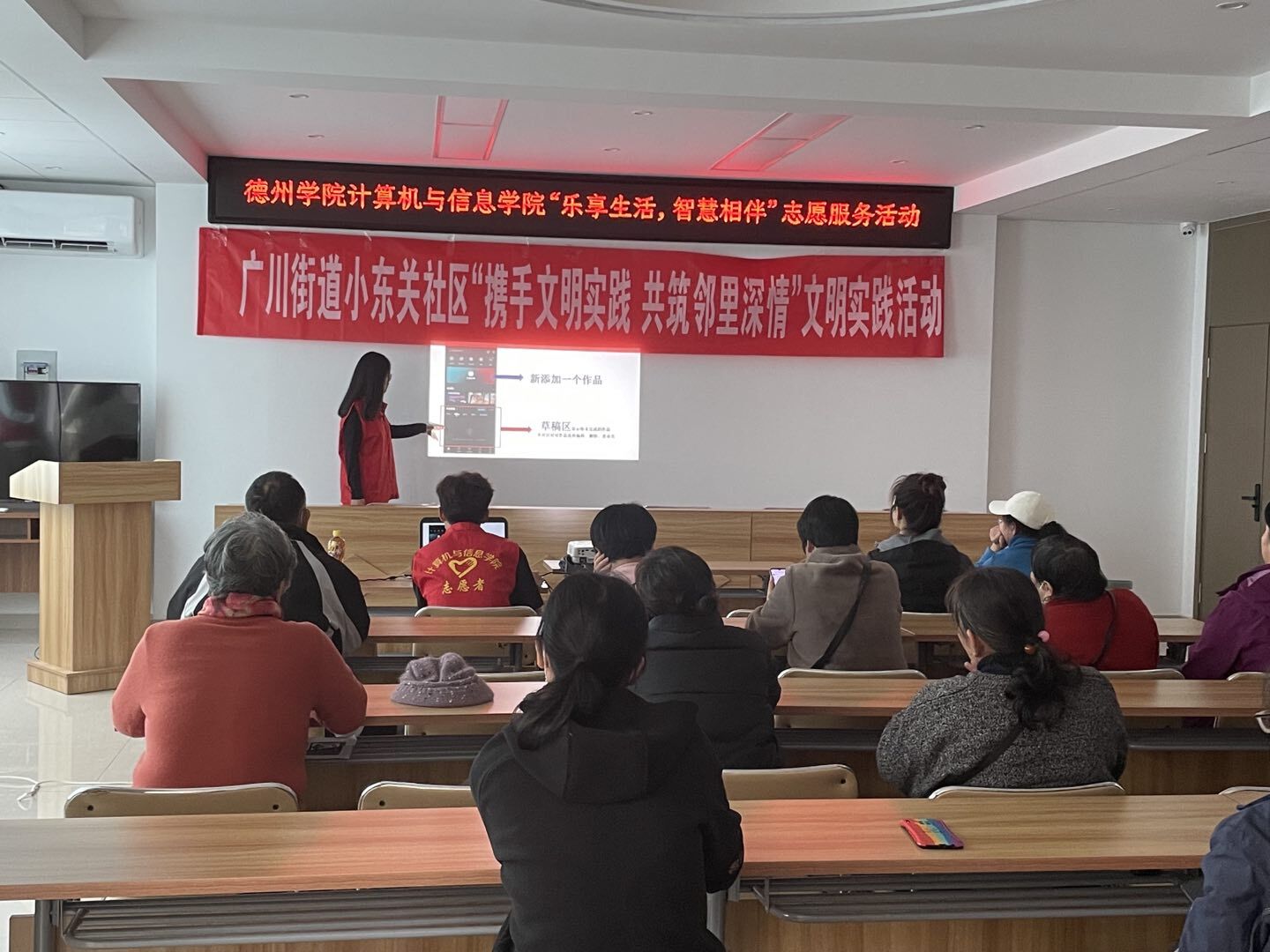 志愿者们走进小关东社区,在社区党群服务中心的荧幕上通过ppt展示的方式为老年人详细讲解了用药打卡小程序的使用步骤。并耐心热情地为老人们进行“一对一”指导。老人们认真聆听,跟随志愿者的讲解,一步步进行具体操作。老人们表示,通过学习用医小程序的使用,时刻提醒了自己的用药时间,用药剂量和用药情况。不仅如此,志愿者们还向老人们传授了视频剪辑的技巧,让他们能够通过拍摄和剪辑视频记录自己的生活,增加生活乐趣,老人们表示十分感谢志愿者们的教授,他们将会把小程序运用到日常中去,更好的享受生活。